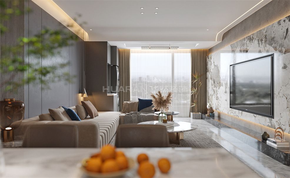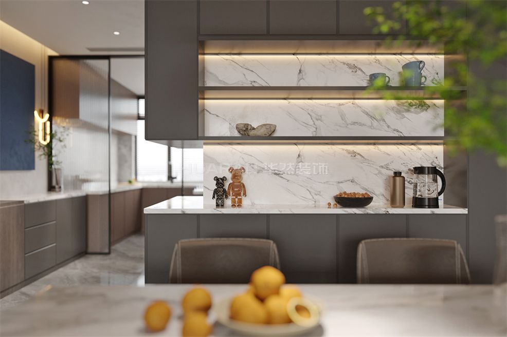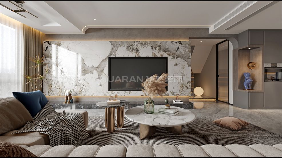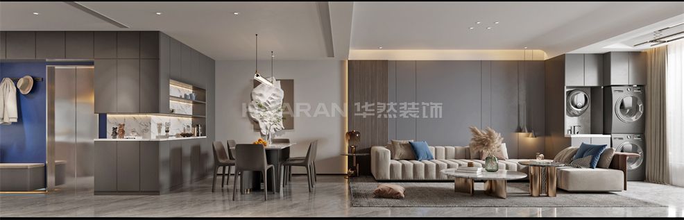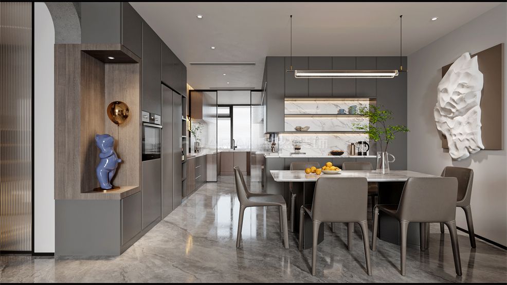 整體極簡(jiǎn)的形式展現(xiàn),低彩度的冷色調(diào),讓視覺(jué)陷入溫柔的包裹之中,淺咖調(diào)沙發(fā)、無(wú)主燈設(shè)計(jì)、輕奢簡(jiǎn)約的巖板+格柵背景墻,并加入恰到好處的自然光線填充,帶來(lái)沉穩(wěn)而寧?kù)o的氛圍美感。高級(jí)灰和炫酷黑的結(jié)合,彰顯出屋主不凡的品味與格調(diào)。營(yíng)造出冷淡靜謐的氛圍,